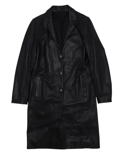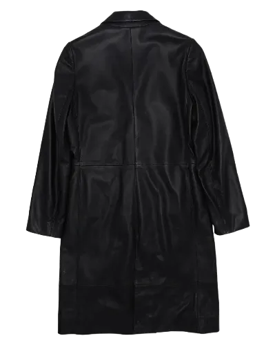With its long-line silhouette and classic black leather finish, this coat is designed to elevate any wardrobe. Perfect for layering over casual fits or complementing more formal attire, it serves as a versatile piece that transitions from day to night with ease.