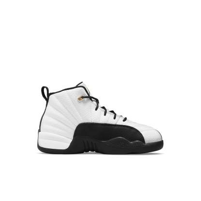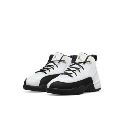 The Air Jordan 12 Retro PS "Royalty" is a great choice for young kids. Resurfacing the two-tone color blocking of the original "Taxi" colorway, this sneaker features a white tumbled leather upper with radiating stitched lines. Black lizard-textured overlays and metallic gold eyelets provide support and style, while lightweight cushioning comes courtesy of a Phylon midsole. A herringbone-traction rubber outsole completes the look and provides superior grip.