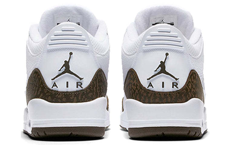 Bringing back the color scheme first released in 2001, the Nike Air Jordan 3 Retro "Mocha" complements the white tumbled leather upper with brown elephant print accents. The brown color story is extended to the outsole and Jumpman logo at the heel.