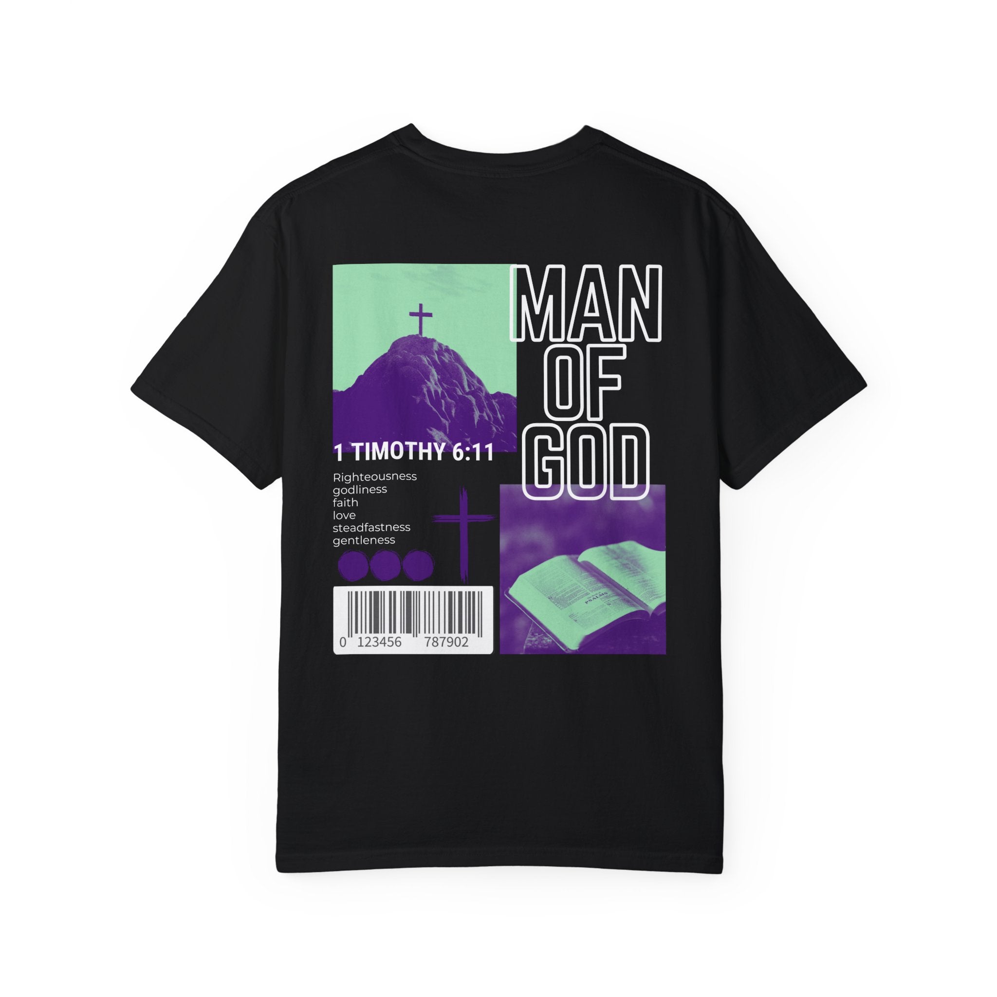 The shirt features a striking design with vibrant colors and spiritual imagery, including a cross atop a mountain and an open Bible, symbolizing strength and devotion. A modern barcode detail adds a unique, contemporary touch, making this tee perfect for casual wear, church events, or sharing your faith in style.