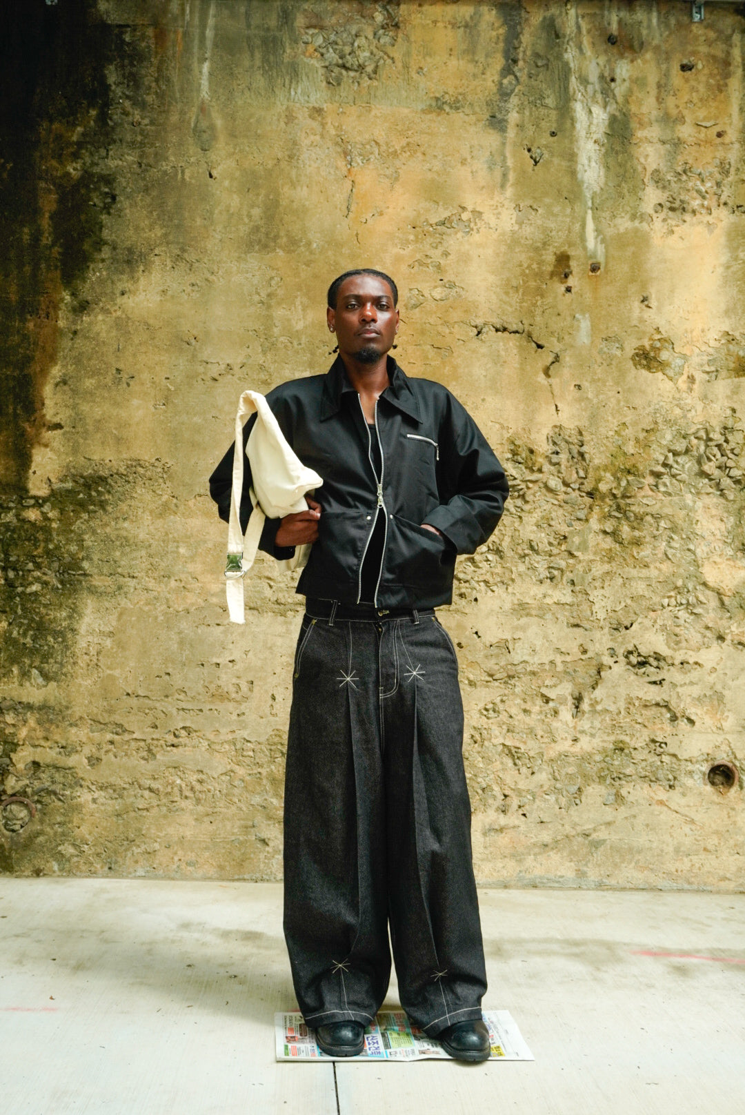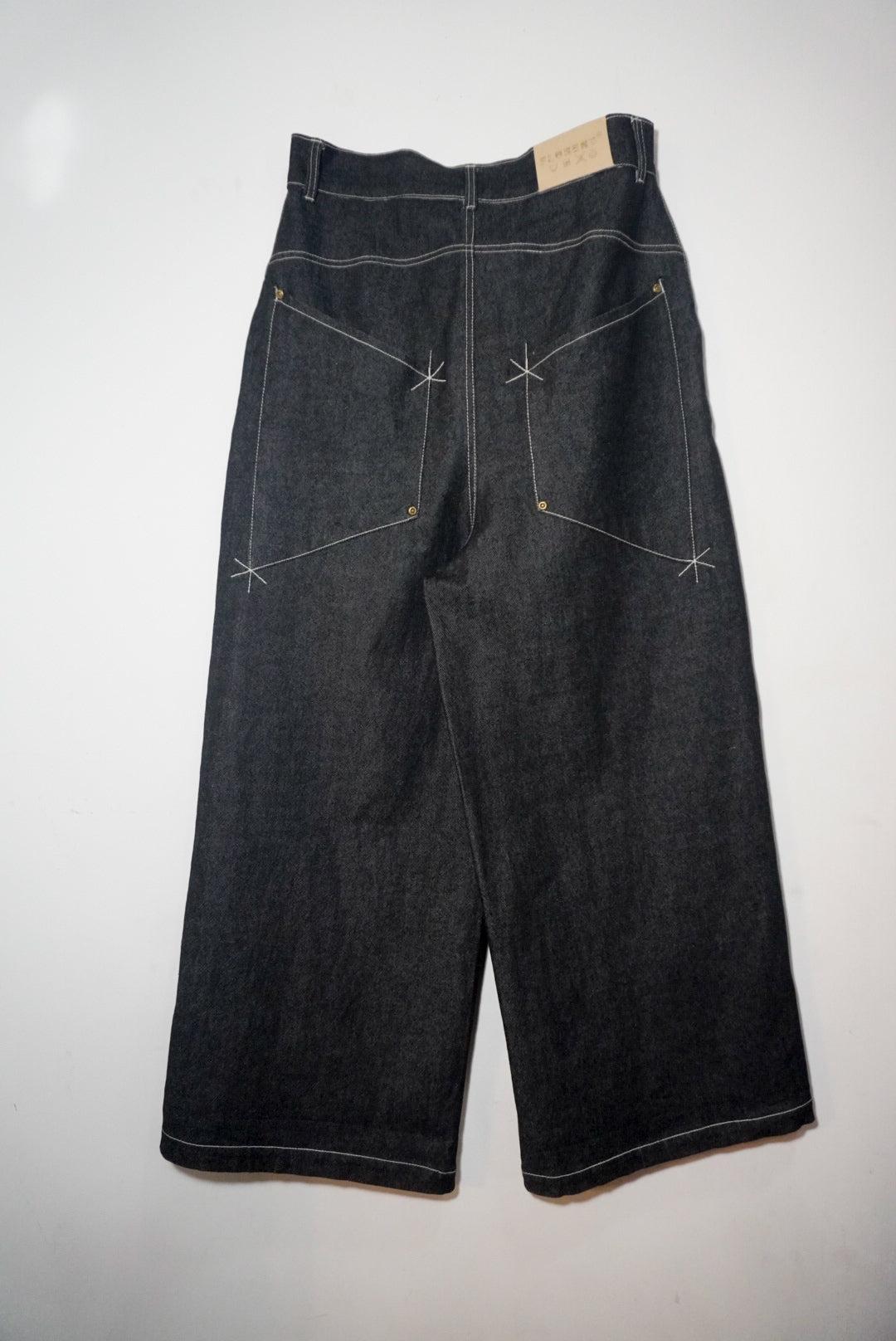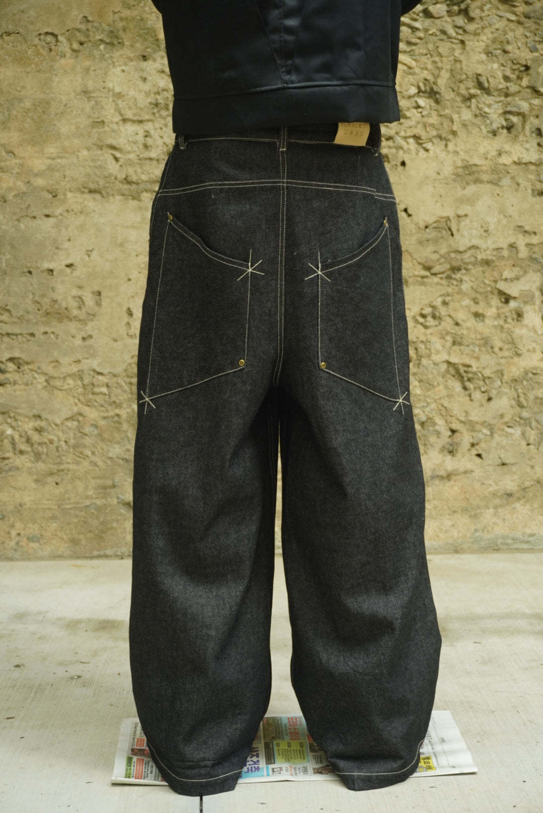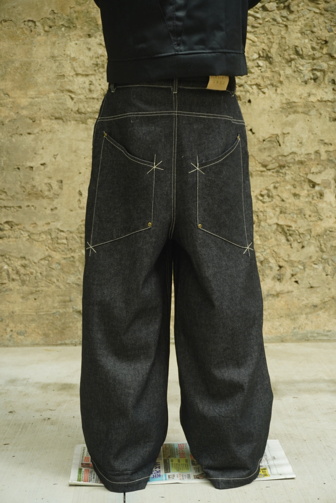 • Oversized back pockets for a bold, utilitarian aesthetic Custom leather back patch, crafted for character with age